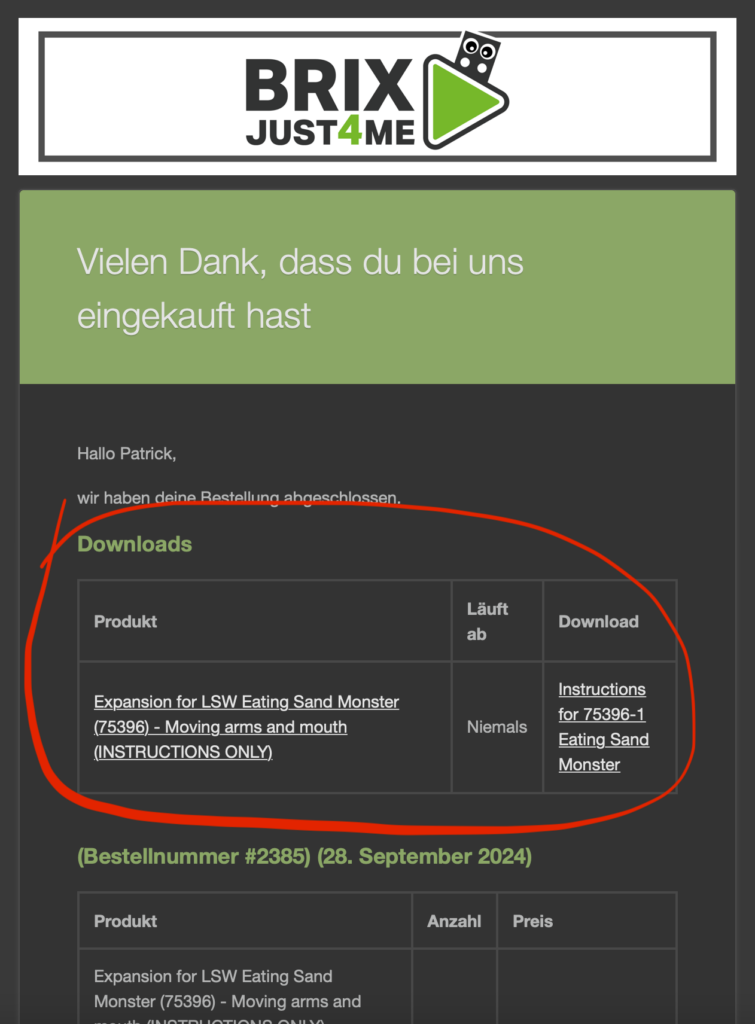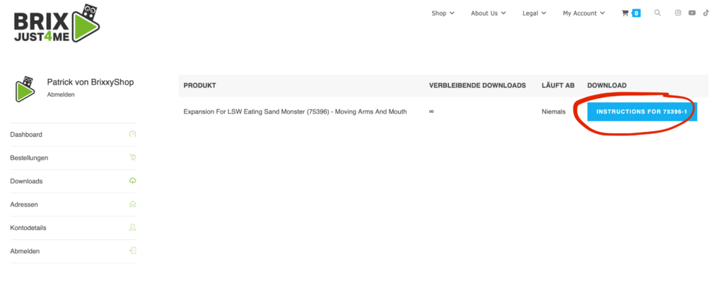 As of the end of 2024 most of our instructions are sent out to your email-address automatically once your order is paid. Look at the message with the title „Deine Bestellung bei Brixpando ist nun abgeschlossen“ (Old: Brixxyshop), at the top you will find all the files that have been unlocked by your order: